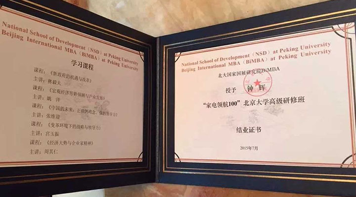 同時,經(jīng)過一年的學(xué)習(xí)和相處,“家電領(lǐng)航100”北大班的同學(xué)們迎來了結(jié)業(yè)的日子。匯利興集團董事長鐘輝為此次畢業(yè)學(xué)員,中國慧聰家電城董事總經(jīng)理宋冰晨先生為“家電領(lǐng)航100”北大班的同學(xué)們頒發(fā)結(jié)業(yè)證書。