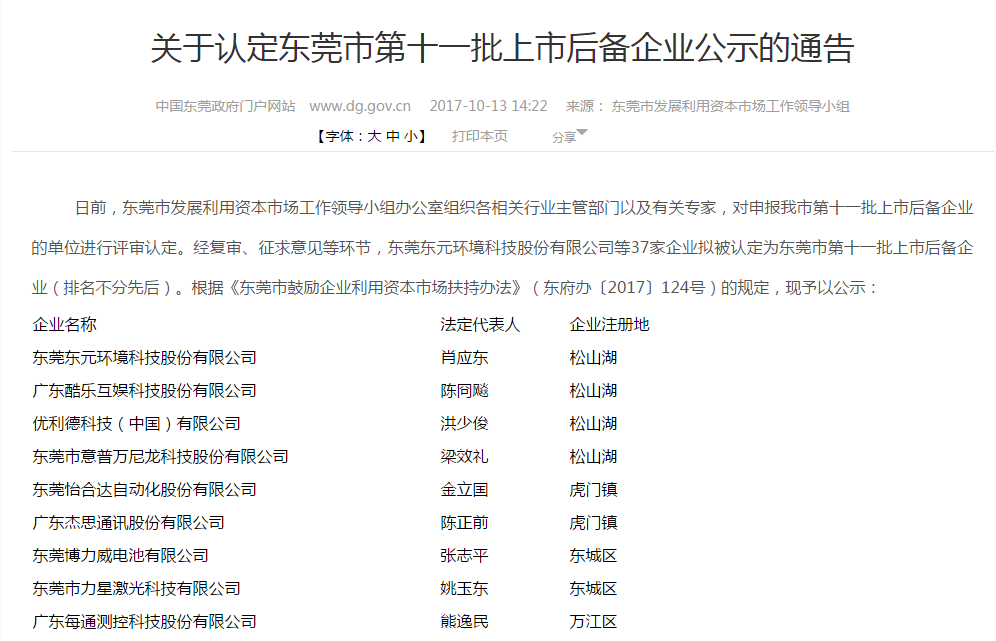 關(guān)于認(rèn)定東莞市第十一批上市后備企業(yè)公示的通告