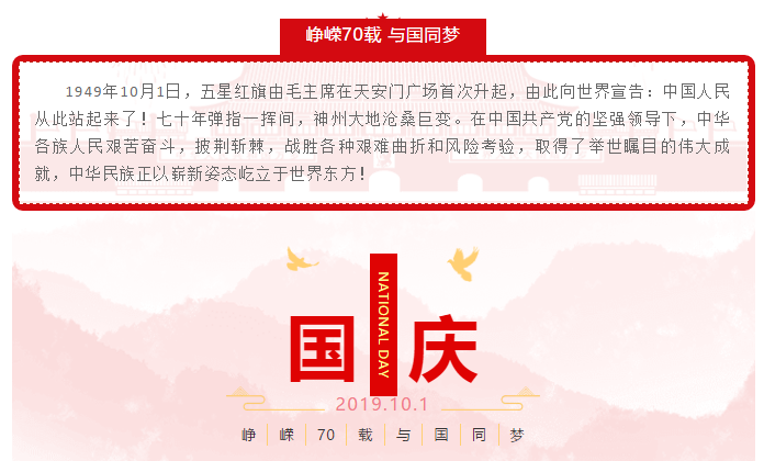 禮贊新中國,奮進(jìn)新時代!值此中華人民共和國成立70周年的美好時刻,讓我們共同祝愿我們偉大的祖國更加繁榮富強(qiáng)!祝愿我們偉大的人民更加幸福安康