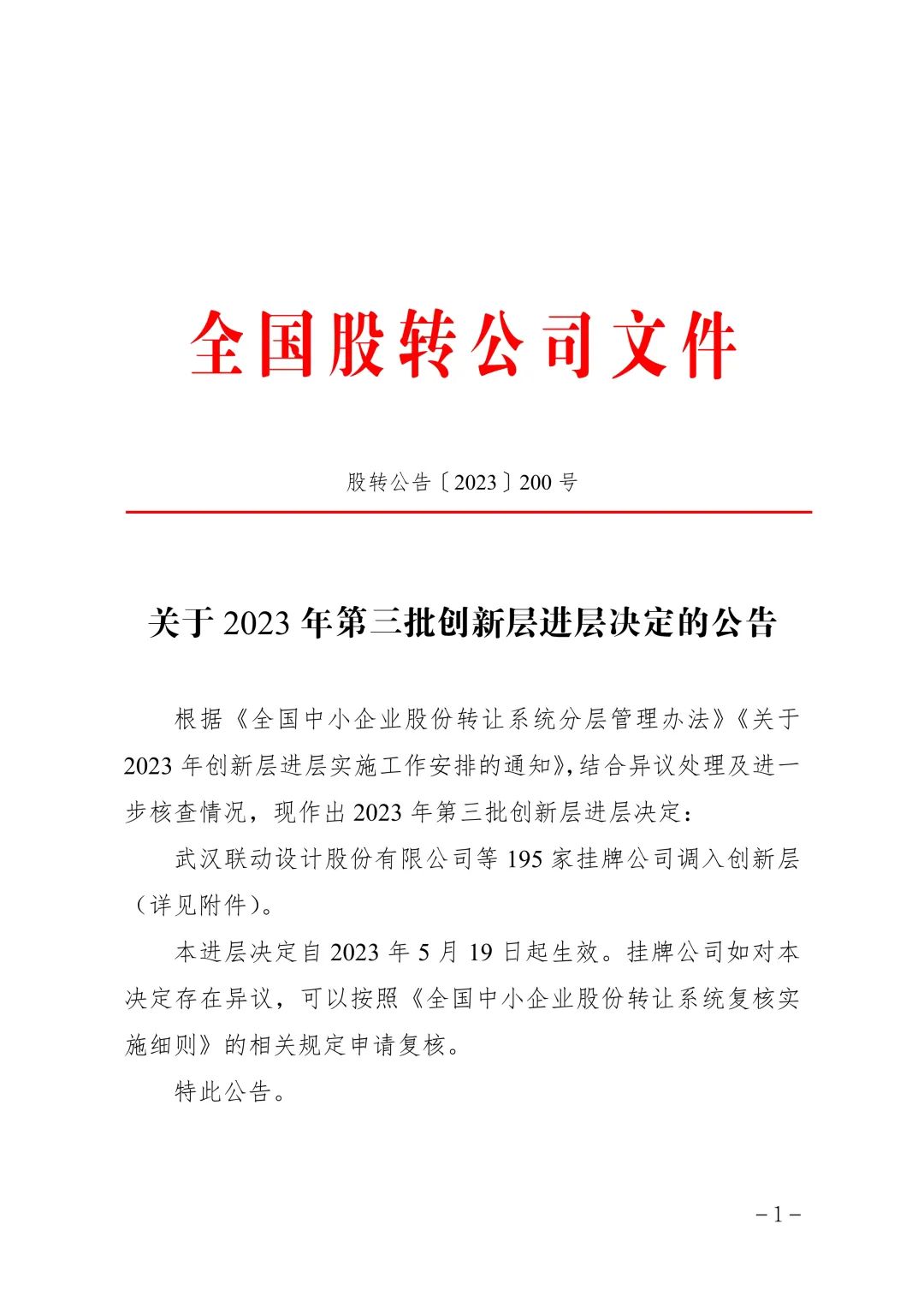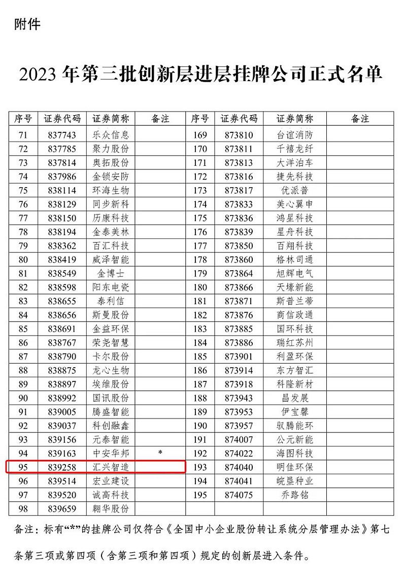 全國中小企業(yè)股份轉(zhuǎn)讓系統(tǒng)有限責(zé)任公司于2023年5月17日在其官網(wǎng)發(fā)布的《關(guān)于2023年第三批創(chuàng)新層進(jìn)層決定的公告》(股轉(zhuǎn)公告【2023】 200 號),廣東匯興精工智造股份有限公司(股票代碼:839258)憑借持續(xù)增長的經(jīng)營業(yè)績從眾多基礎(chǔ)層掛牌公司中脫穎而出,2023年5月19日正式進(jìn)入新三板創(chuàng)新層,邁向更高層次的資本舞臺。