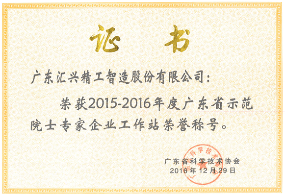匯興智造廣東省示范院士專家企業(yè)工作站榮譽證書