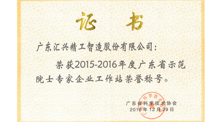 匯興智造榮獲2015-2016年度廣東省示范院士專家企業(yè)工作站榮譽(yù)稱號(hào)