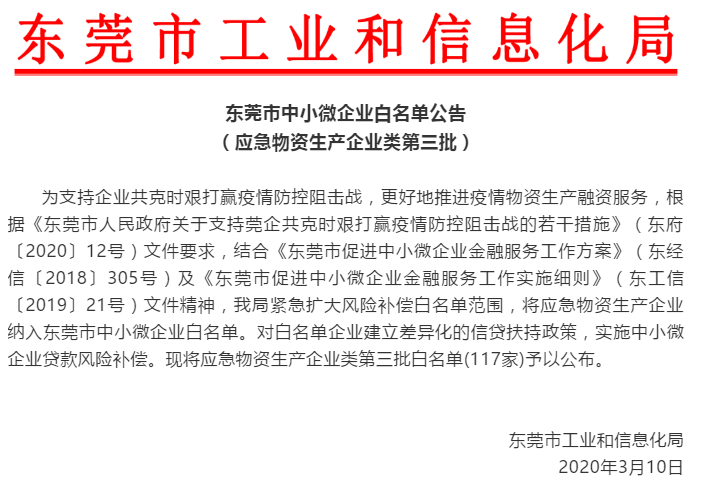 疫情防控期間,為了推動企業(yè)順利復工復產,東莞市陸續(xù)推出系列“暖企政策”,以“組合拳”的方式幫助企業(yè)解決復工復產中遇到的實際問題。為全力支持和推動新冠肺炎疫情防控物資和裝備生產企業(yè)復工復產、擴大生產,2020年2月27日,廣東省工業(yè)和信息化廳出臺了“支持新冠肺炎疫情防控物資和裝備生產企業(yè)擴大生產的獎勵政策”,支持疫情防控物資和裝備生產企業(yè)實施技術改造、擴大生產,獎勵服從國家和省醫(yī)療防控物資調度要求的企業(yè)生產銷售。疫情防控啟動以來,為進一步用好風險補償專項資金,東莞將應急物資生產企業(yè)納入白名單。目前,東莞已將兩批共145家應急物資生產企業(yè)納入白名單。